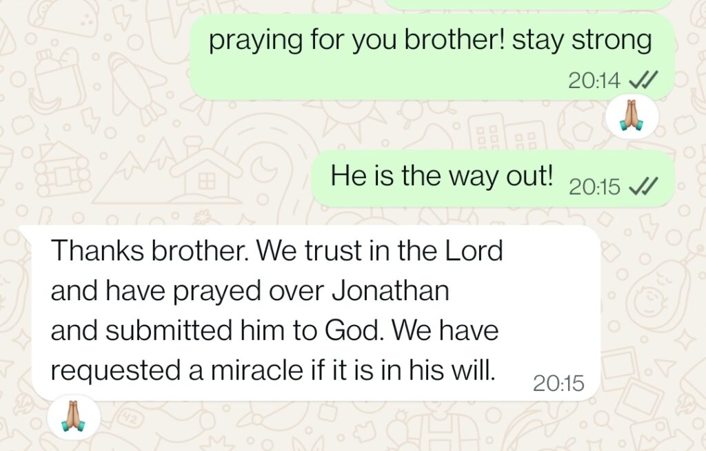In every step of their way, I have only seen their strength grow and their immovable trust on the Lord Jesus Christ, in display. Their complete surrender and dependence on His provision. Even after receiving the news today, that one of their son’s lungs have stopped functioning, oxygen dropping below 75% and with the next approximately 18 hours left to know if their son is going to make it or rest in the Lord. These were the exact words from the father – “We trust in the Lord and have prayed over Jonathan and submitted him to God. We have requested a miracle if it is His Will“